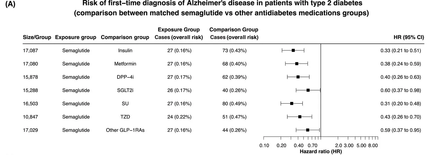 Type 2 당뇨병 환자 대상으로 40-70% 정도 first-time Alzheimer’s disease 진단 확률 감소 효과