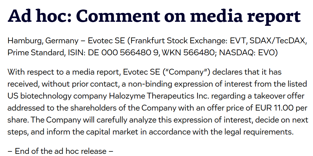 With respect to a media report, Evotec SE (“Company”) declares that it has received, without prior contact, a non-binding expression of interest from the listed US biotechnology company Halozyme Therapeutics Inc. regarding a takeover offer addressed to the shareholders of the Company with an offer price of EUR 11.00 per share. The Company will carefully analyze this expression of interest, decide on next steps, and inform the capital market in accordance with the legal requirements.