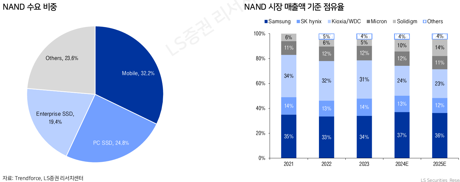 삼성 1위, Kioxia/Western Digital (WDC) 2위, SK하이닉스 3위, Micron 3위