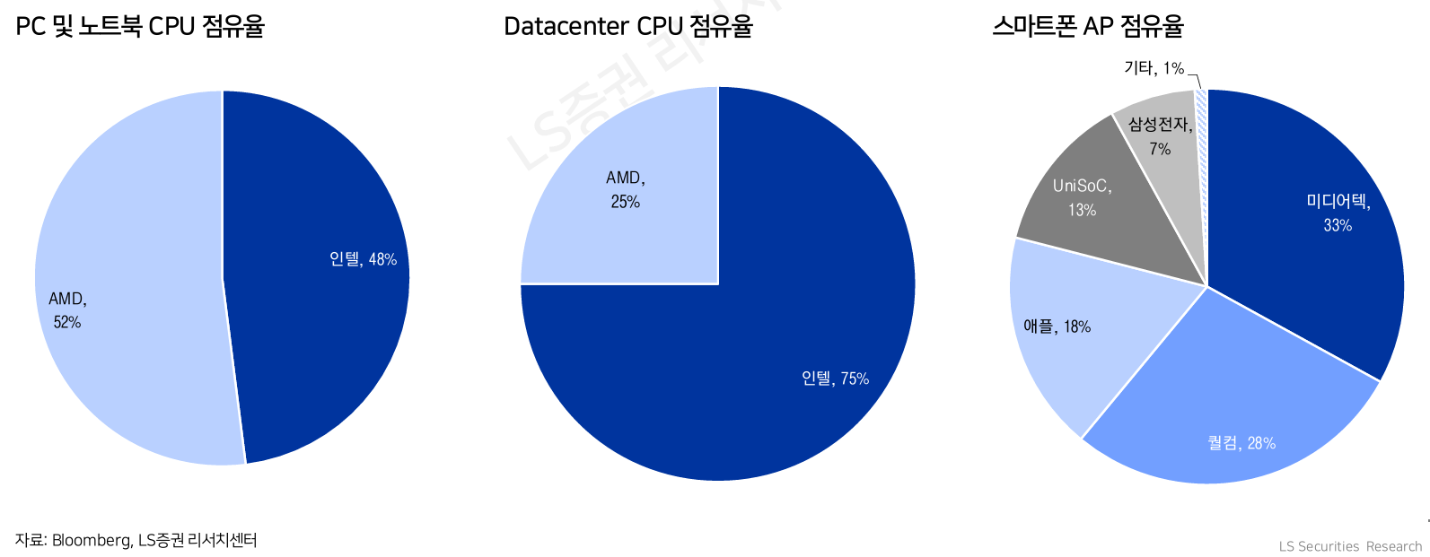 - Mobile AP는 자사 칩 쓰는 애플 빼고는 전부 ARM (ARM) based로 미디어텍이랑 퀄컴이 2황