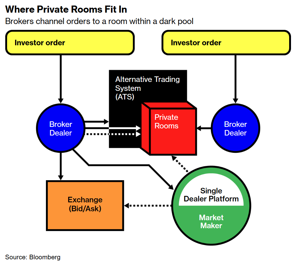 Private rooms are known by a slew of other names including hosted pools, restricted-access rooms, ATS pools, and custom counterparty groups. They’re gaining popularity in the huge, ultra-fast modern market as a way to help firms avoid losing out against players who may be able to move quicker or who have access to superior information.