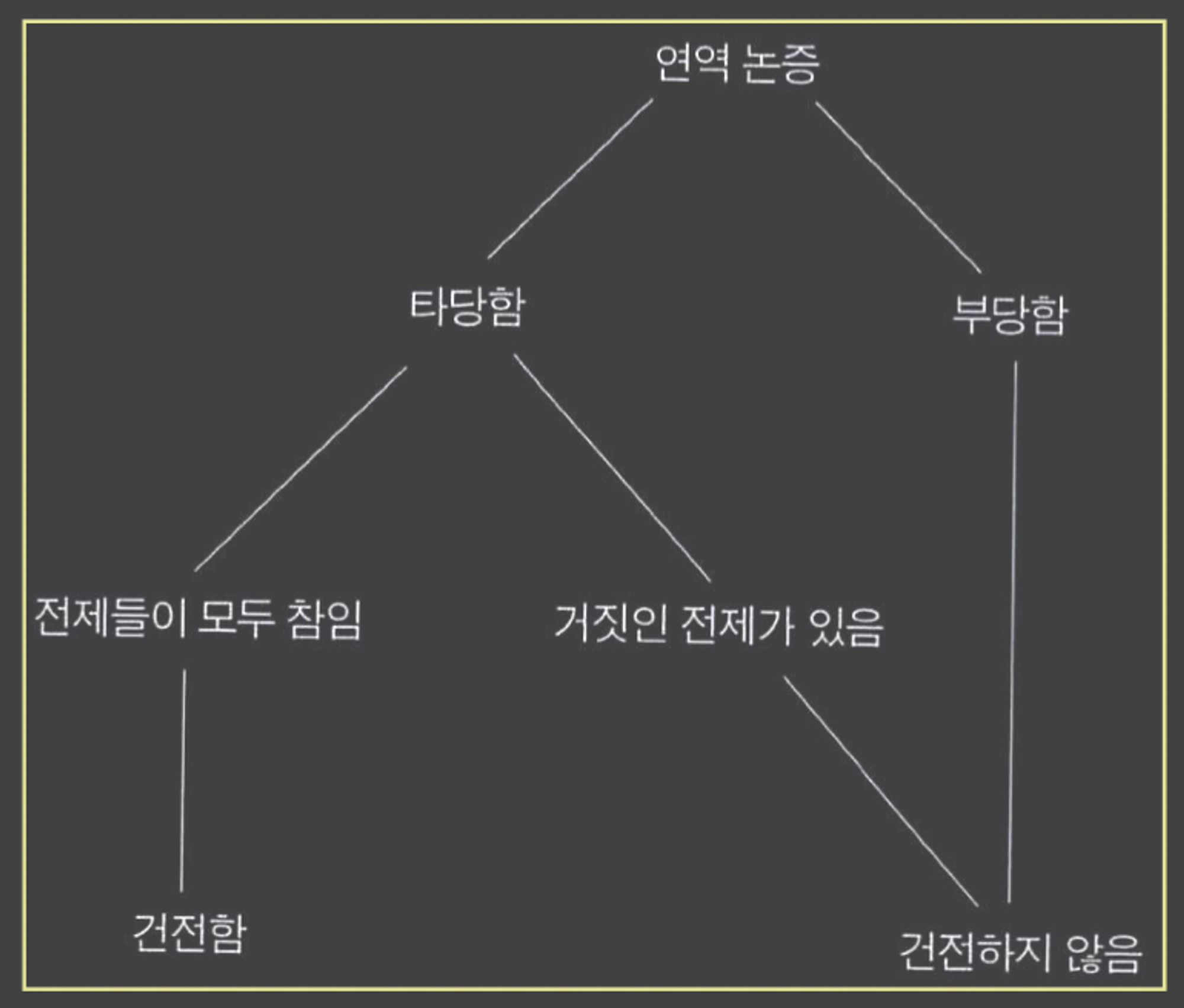 - 주어진 논증의 전제들이 참이라는 가정하에서 결론이 반드시 참이라고 주장하는 경우