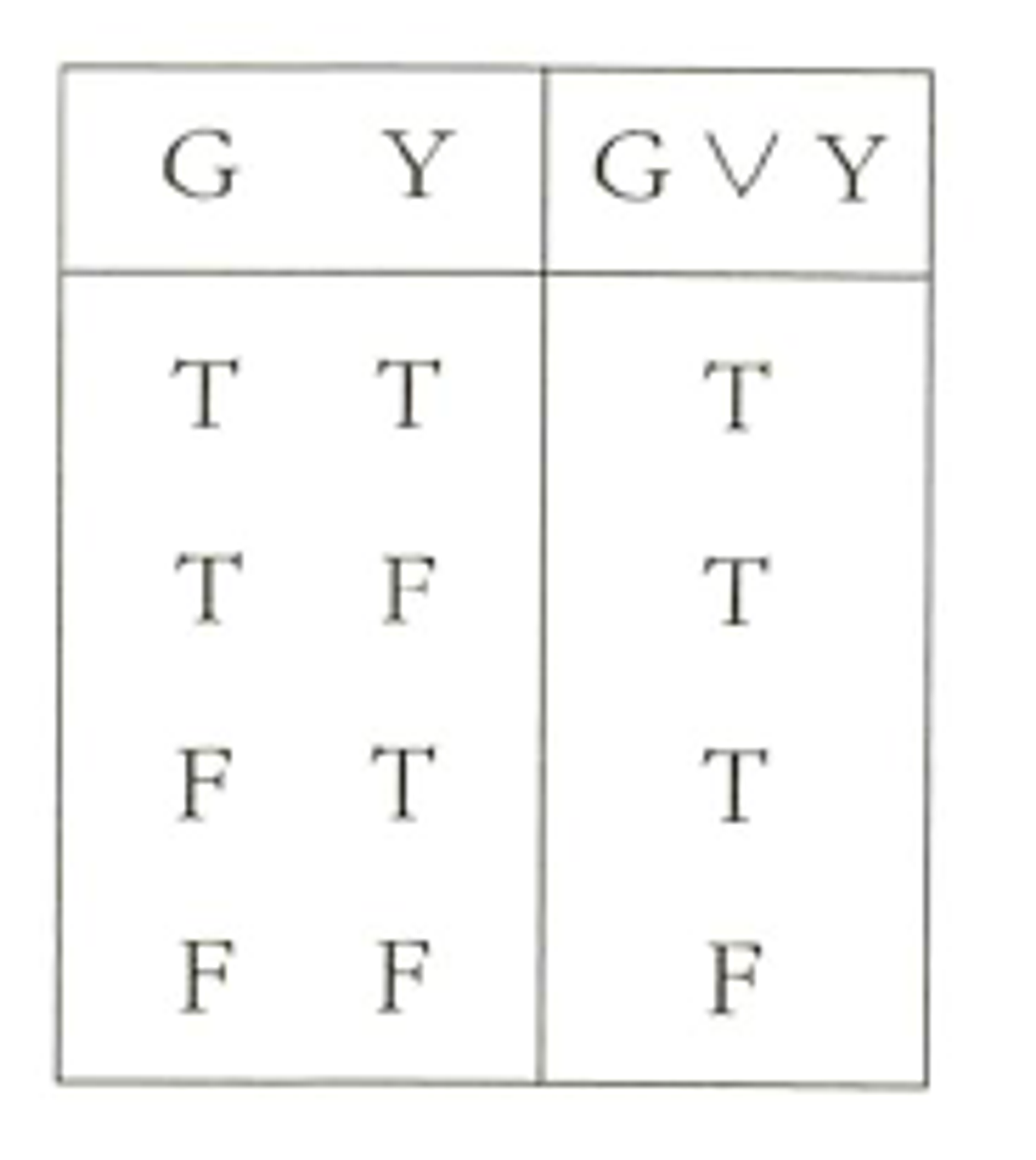 첫 번째 단순 문장을 ’G로 표시하고, 두 번째 단순 문장을 ’Y’로 표시하자. 그리고 논리적 연결사 ’또는’을 ’∨’라는 기호로 표시하자. 그러면 위의 복합 문장은 다음과 같이 기호화할 수 있다.
