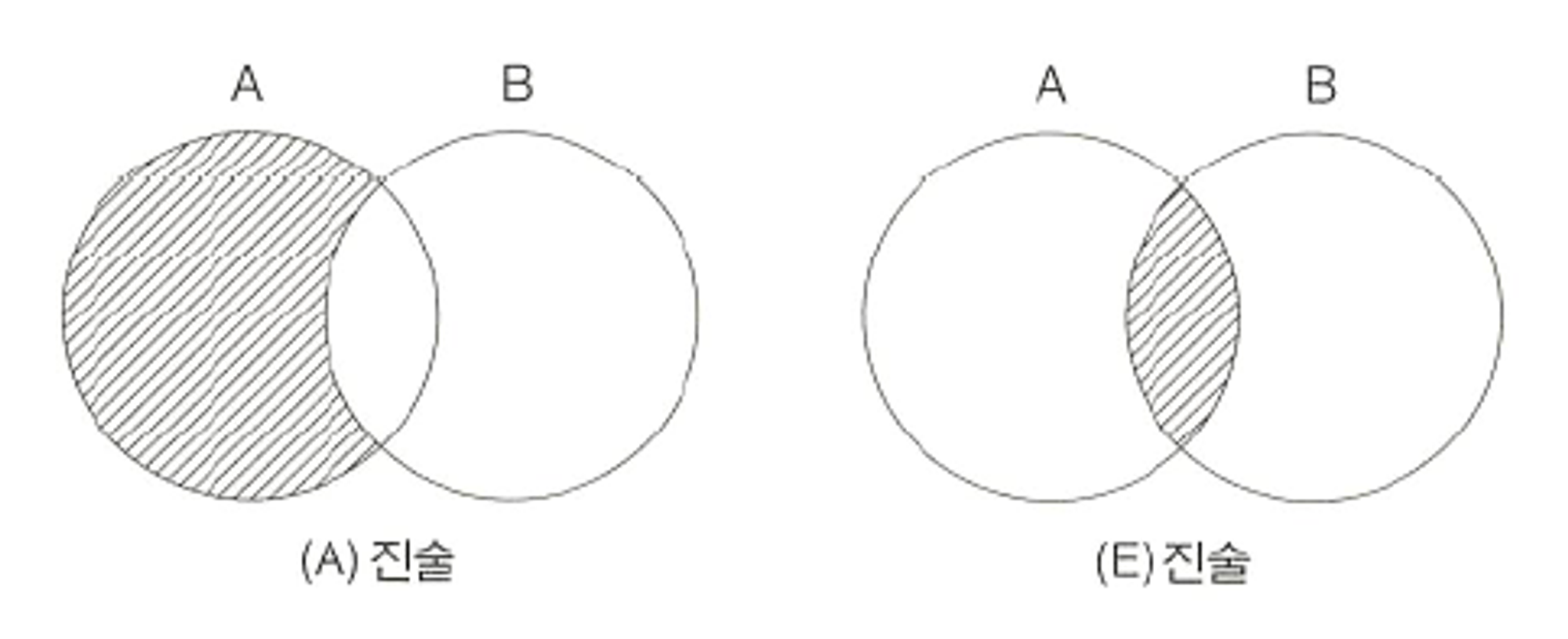 전통 논리학은 ’모든 F들은 G이다’라는 전칭긍정 진술을 (A) 진술이라고 부른다. 그리고 ’어느 F도 G가 아니다’라는 전칭부정 진술을 (E) 진술이라고 부른다. 그리고 ’어떤 F들은 G이다’는 특칭긍정 진술을 (I) 진술이라고 부른다. 그리고 끝으로 ’어떤 F들은 G가 아니다’는 특칭부정 진술을 (O) 진술이라고 부른다.
